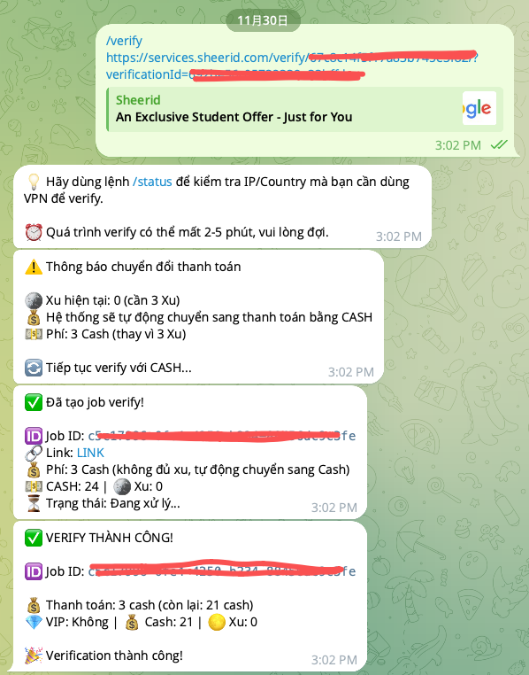 前往机器人 @SheerID_VIP_Bot ,输入 /giftcode + 礼包code 命令,领取3Coin 奖励,用于验证学生身份,然后输入 /verify https://services.sheerid.com/verify/*** ( 就是Google 验证您的学生身份链接 )命令,开始验证身份。验证需要几分钟时间,请耐心等待,自动机器人回复你验证成功。